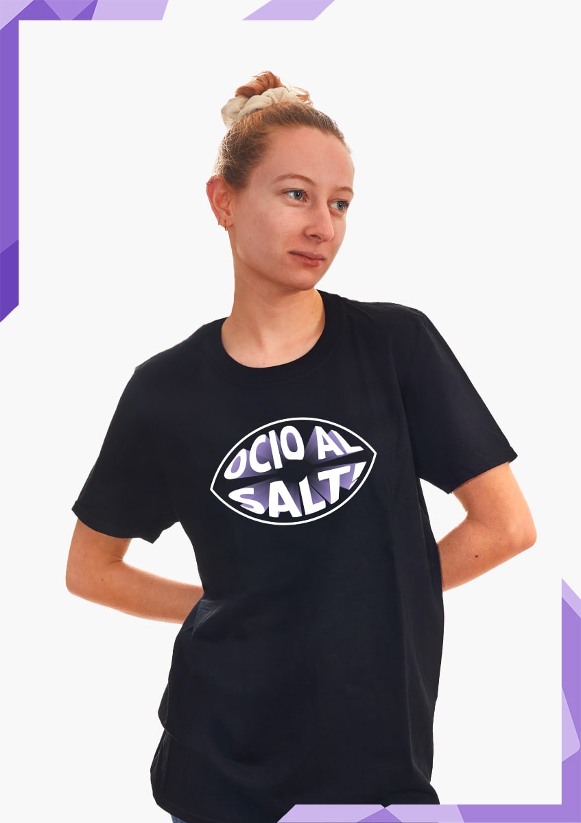 T-shirt maniche a giro, collo alto, girocollo. Stampa diretta frontale del design Ocio Al Salt. Transfer logo Lalilla retro